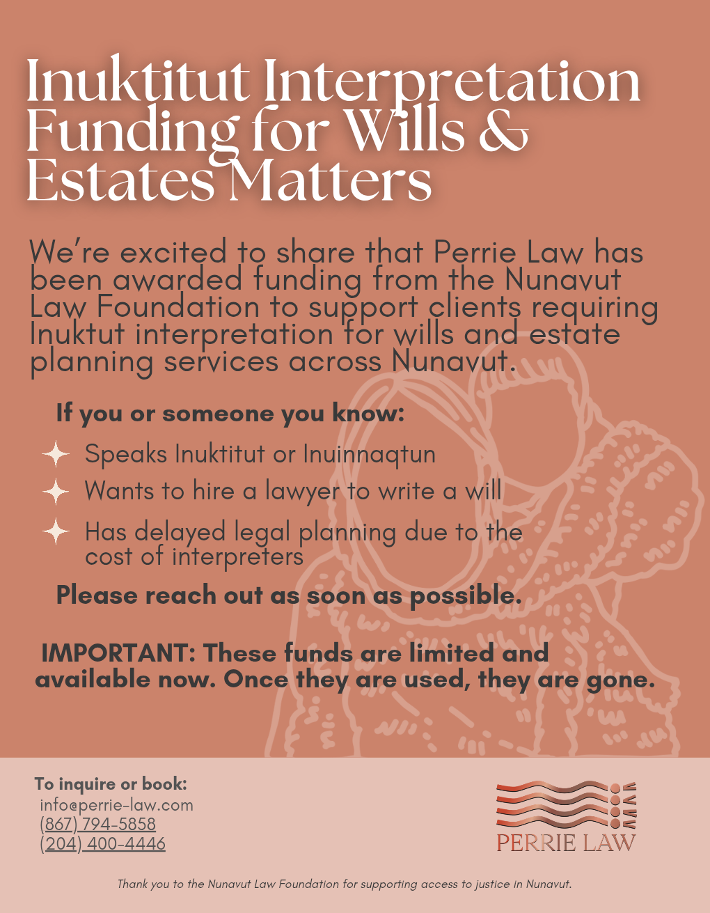 - Grant to support clients across Nunavut who require Inuktut interpretation for wills and estate planning services.